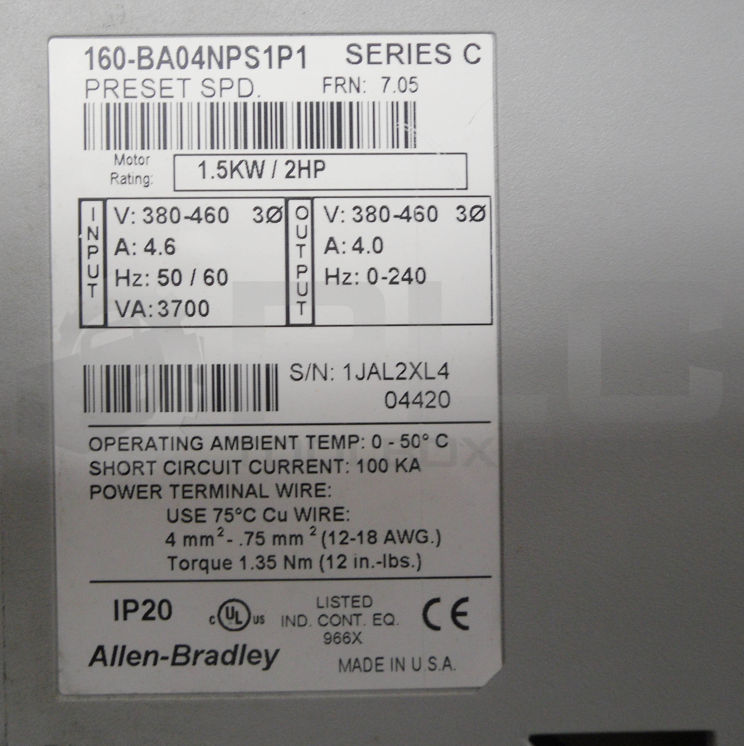 • ALLEN BRADLEY 160-BA01NPS1P1 DRIVE SPEED CONTROLLER .5 HP 460V SER C IP20 K-520A