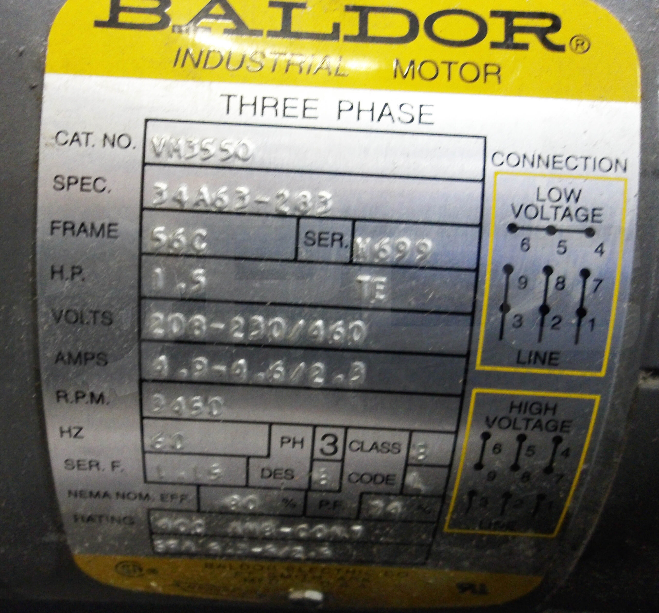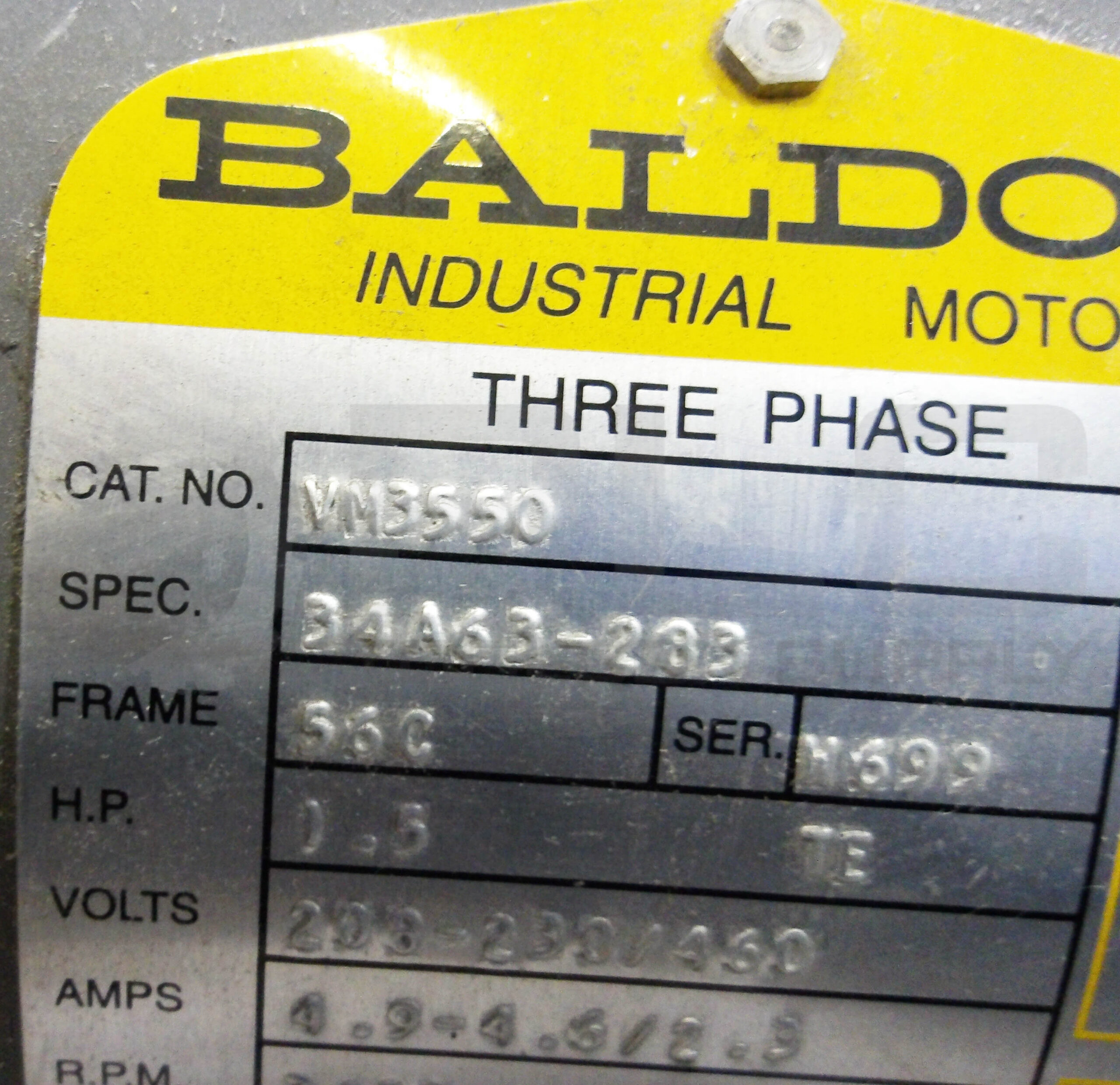 • BALDOR VM3550 INDUSTRIAL MOTOR HP1.5 20-230/460V 60HZ 3450RPM W/ 33074 BLOWER