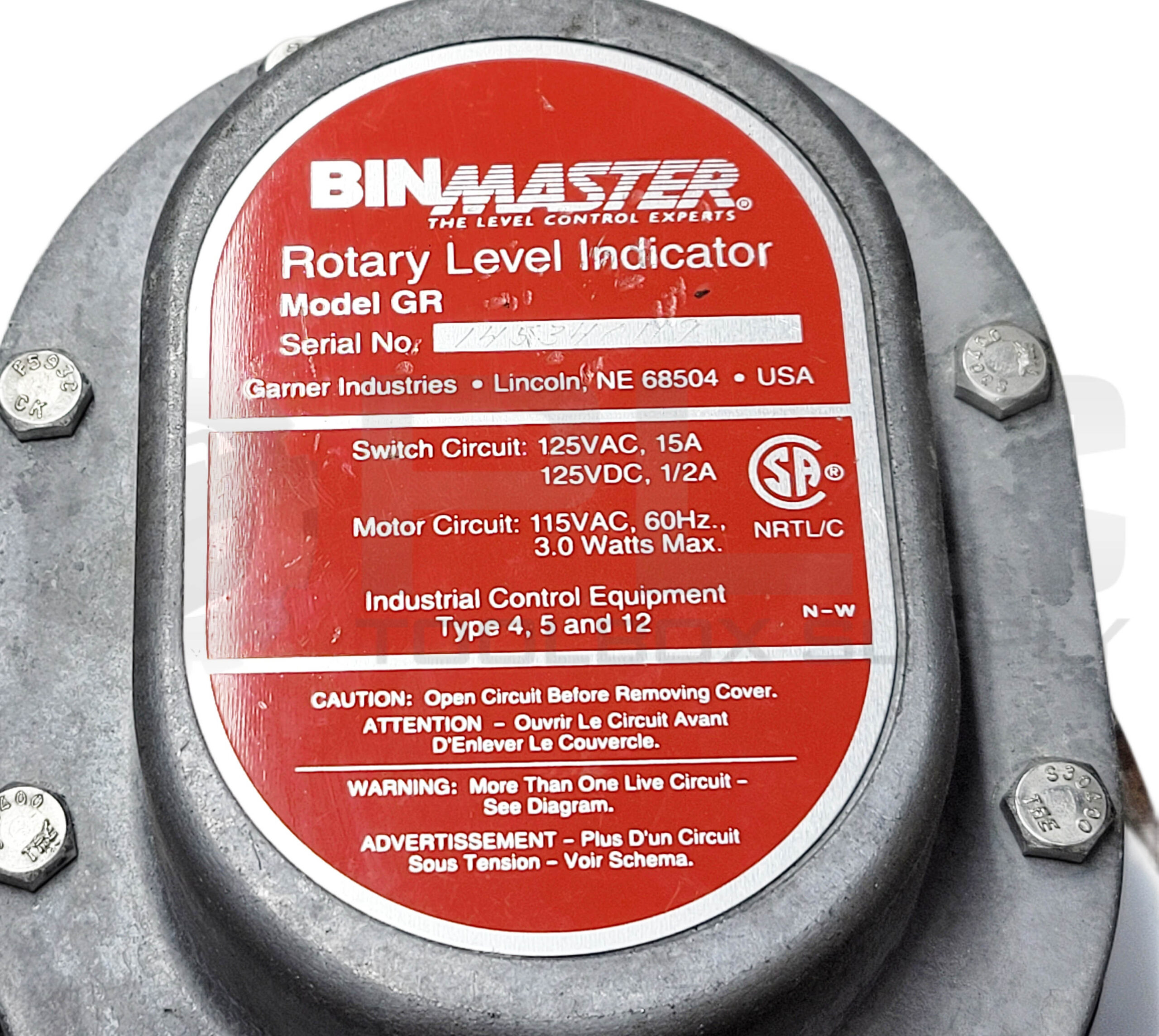 • BINMASTER MODEL GR ROTARY LEVEL INDICATOR 125VAC/DC 115VAC 15/0.5A 60HZ 3.0W