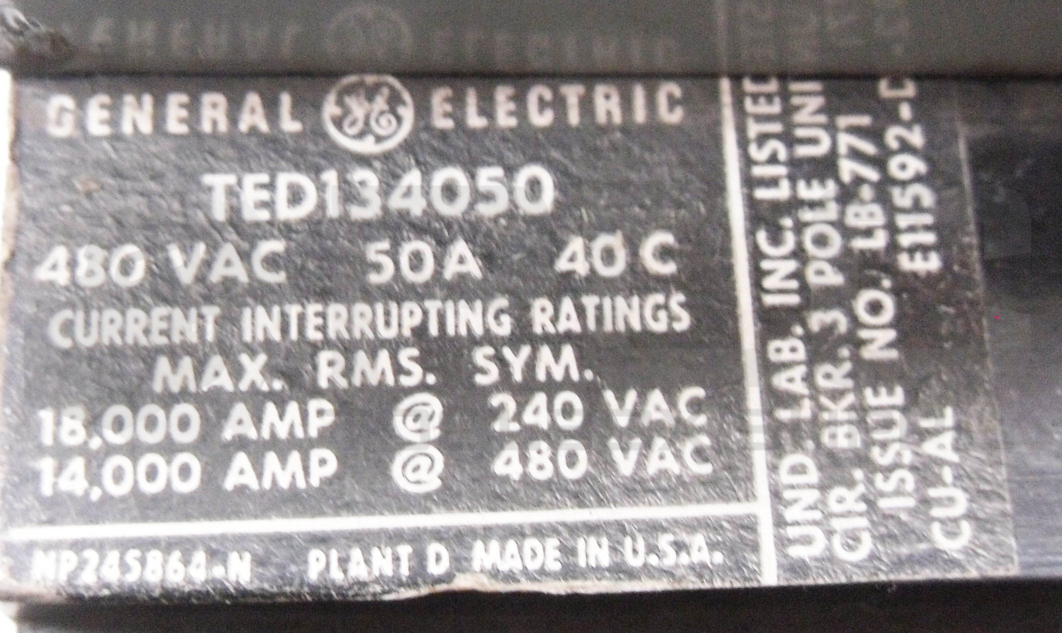 GENERAL ELECTRIC TED134040 INDUSTRIAL CIRCUIT BREAKER 40A 480VAC 250VDC 3 POLE