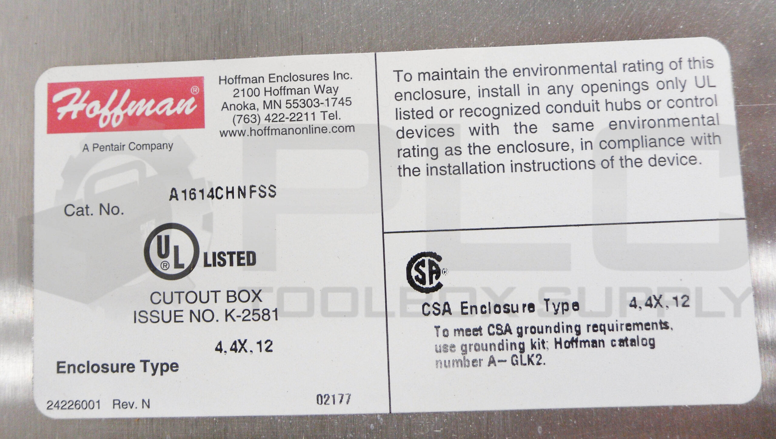 • HOFFMAN A1614CHNFSS SS JUNCTION BOX 14″ X 16″ X 6″