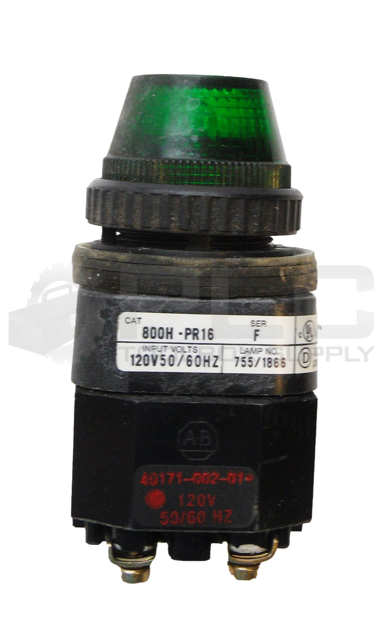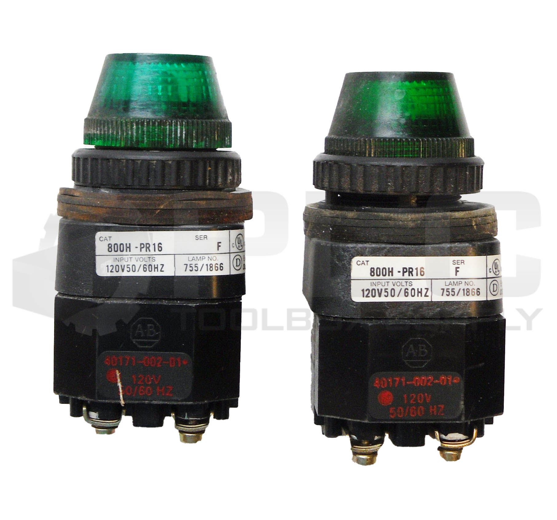 • LOT OF 2 ALLEN BRADLEY 800H-PR16 /F PILOT LIGHT GREEN W/ 40171-002-01 COIL