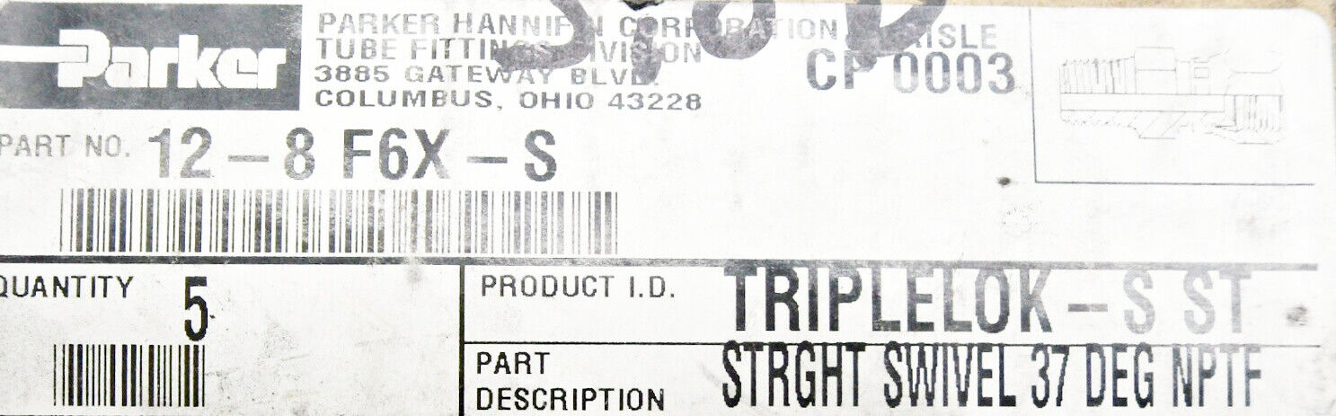 • LOT OF 5 NEW PARKER 12-8 F6X-S TRIPLELOCK-S STSTRAIGHT SWIVEL 37 DEG NPTF