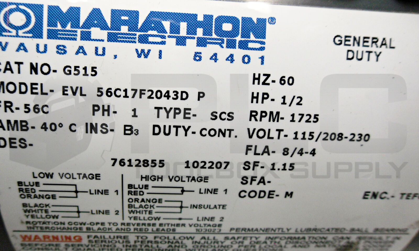 • MARATHON EVL 56C17F2043D P MOTOR 1/2HP 1725RPM FR: 56C, G515