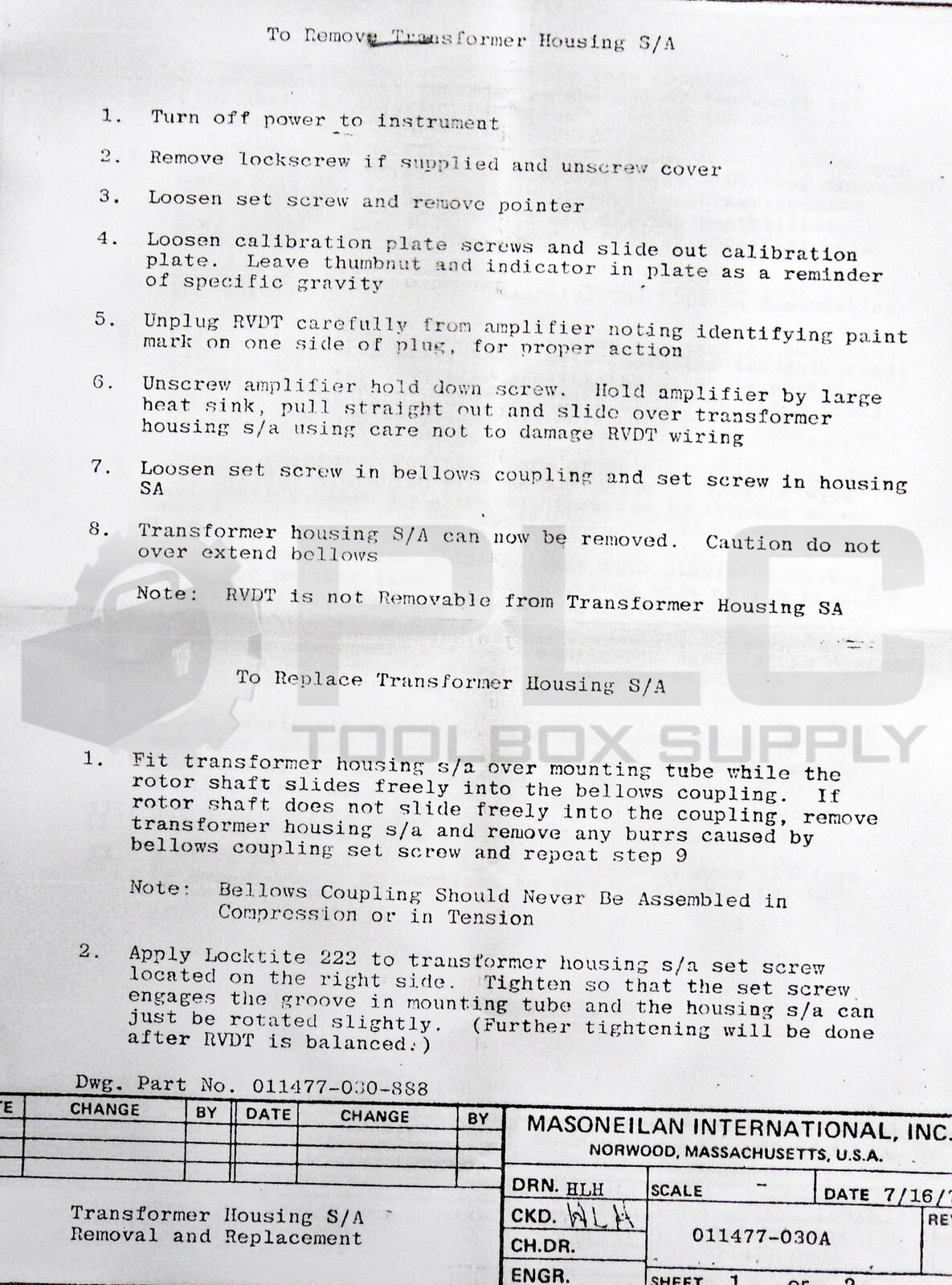 MASONEILAN INC. 011477-027-888 TRANSFORMER 011477-030-888