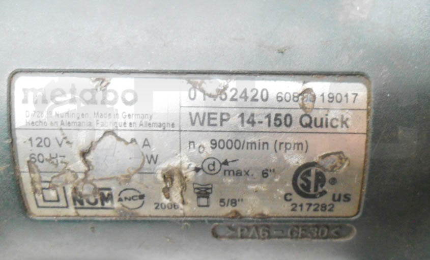 • METABO WEP 14-150 QUICK ANGLE GRINDER 6″ 120V 12.0A 60HZ 01452420 6080019017