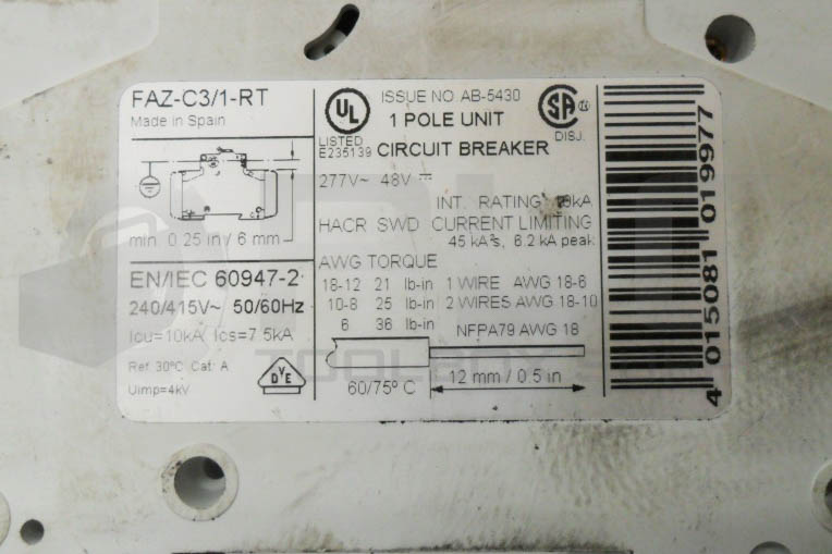 • MOELLER FAZ-C3/1-RT CIRCUIT BREAKER 1 POLE 3A 277V 50/60HZ