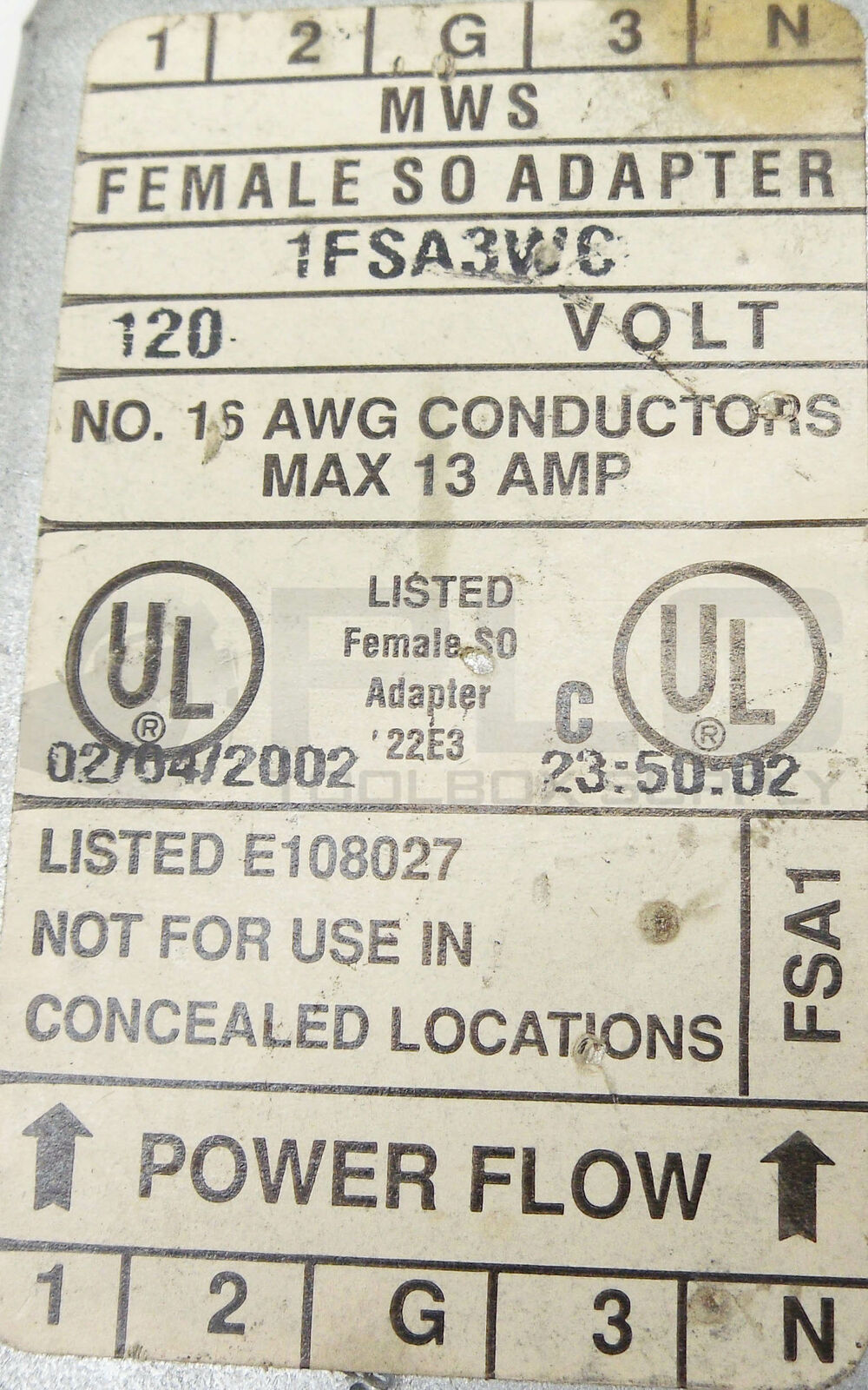 • MWS 1FSA3WC FEMALE SO ADAPER 120V NO.16 AWG CONDUCTORS MAX 13 AMPS