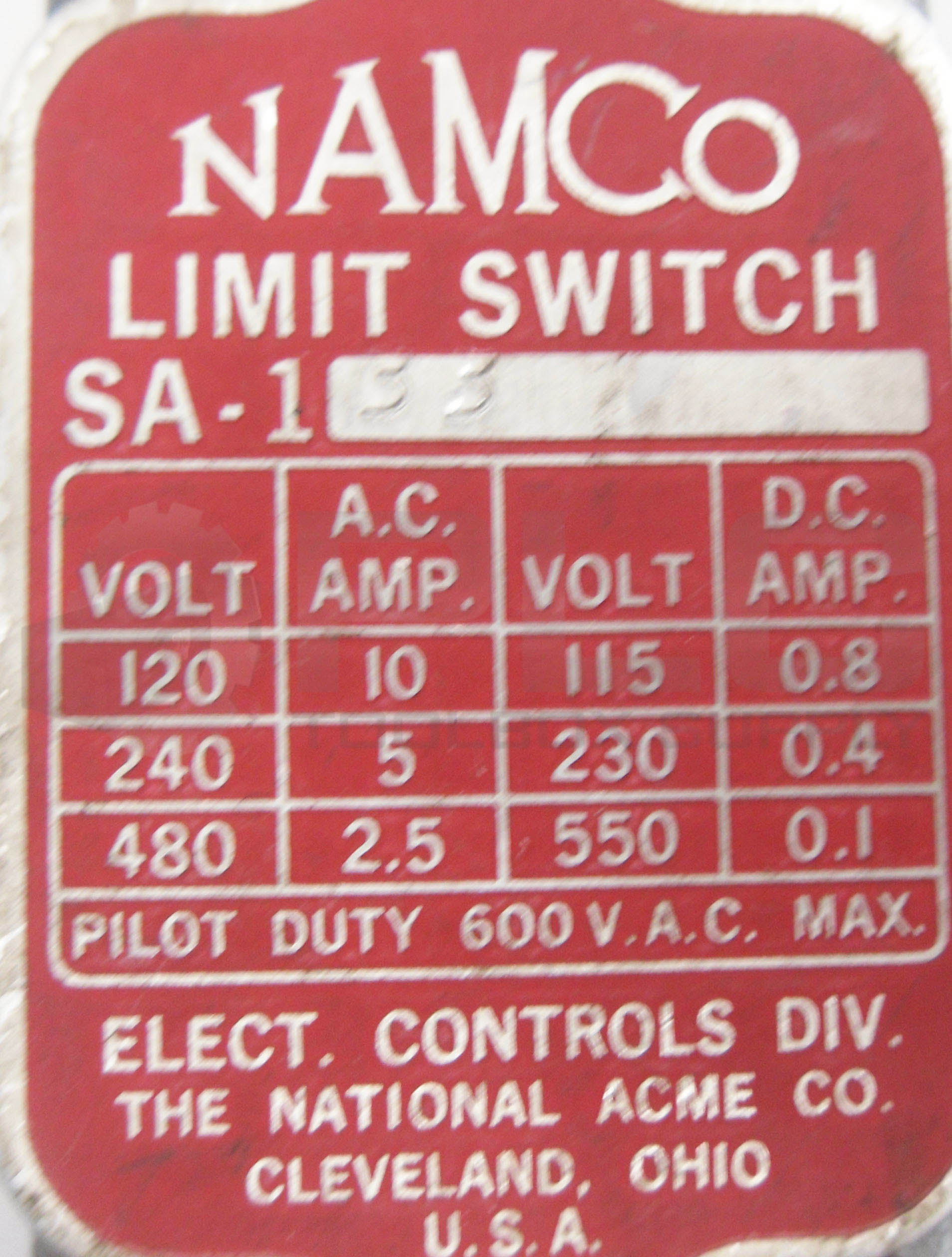NAMCO SA-133 LIMIT SWITCH 600VAC 10A