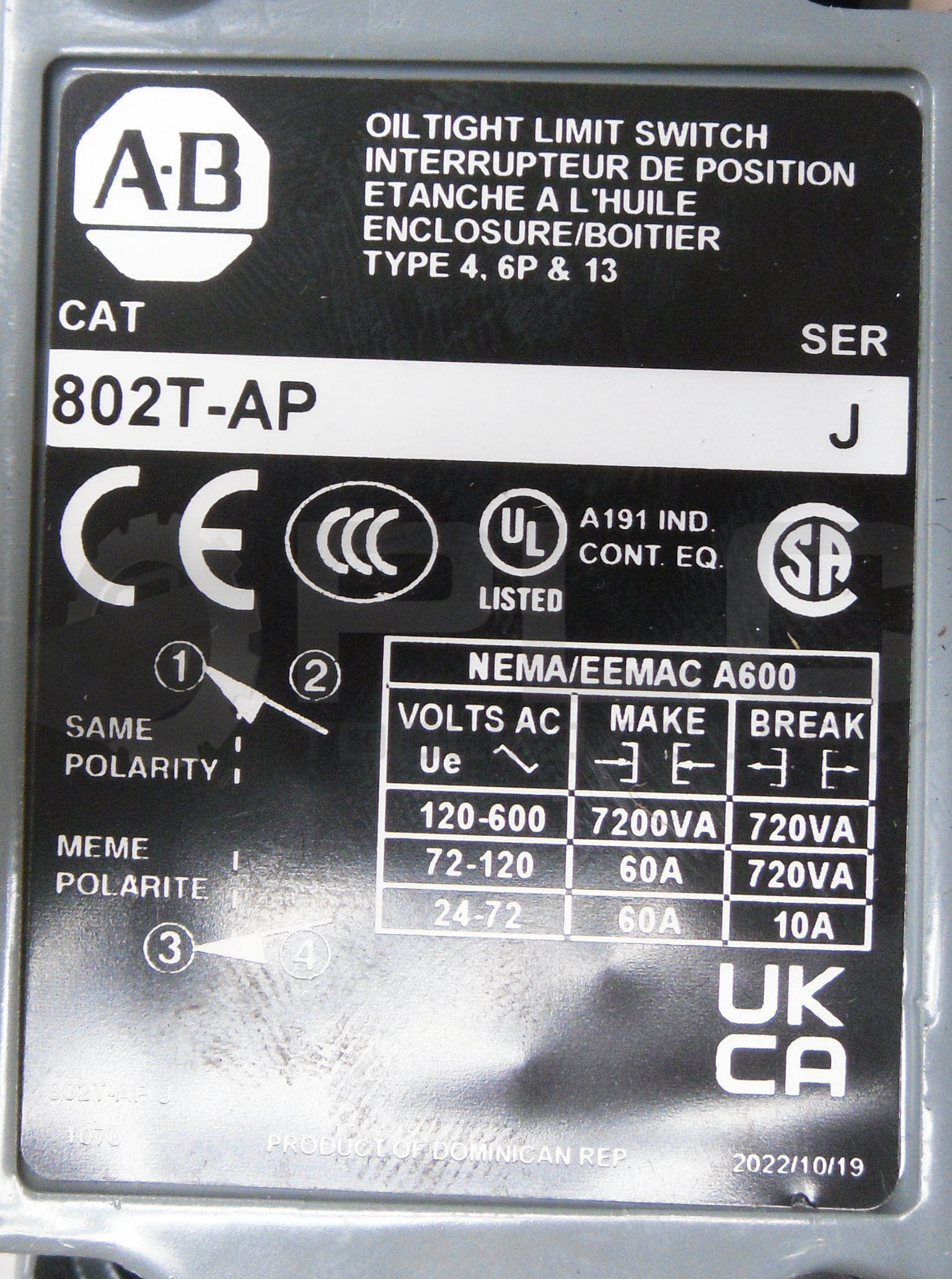 NEW ALLEN BRADLEY 802T-AP /J OILTIGHT LIMIT SWITCH W/ 40146-747-63 OPERATOR HEAD