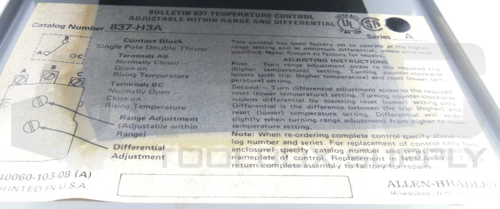 NEW ALLEN BRADLEY 837-H3 SER A TEMPERATURE CONTROLLER 140-290°F