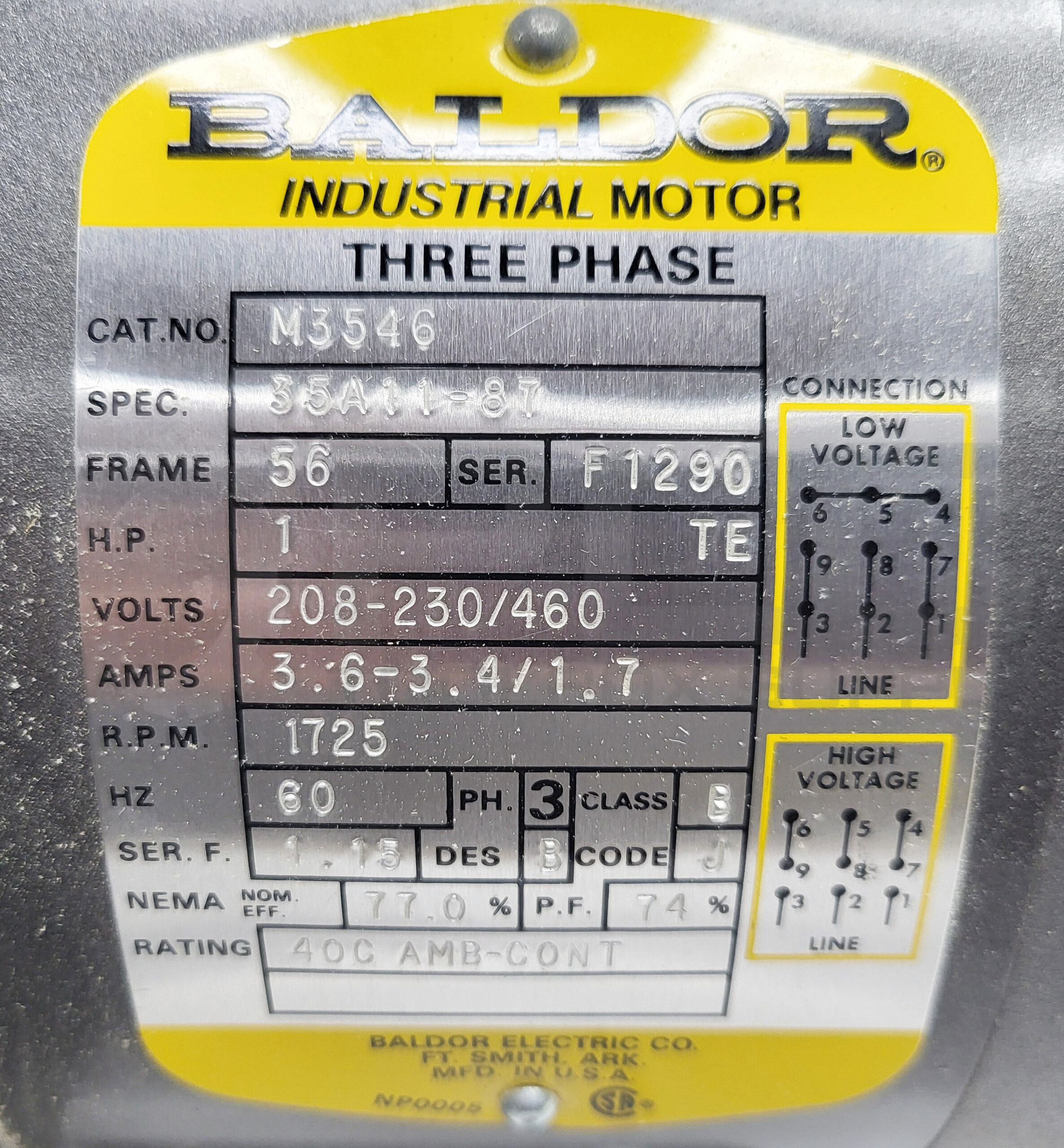 NEW BALDOR M3546 MOTOR 1HP 3PH 1725RPM FR: 56 Spec: 35A11-87