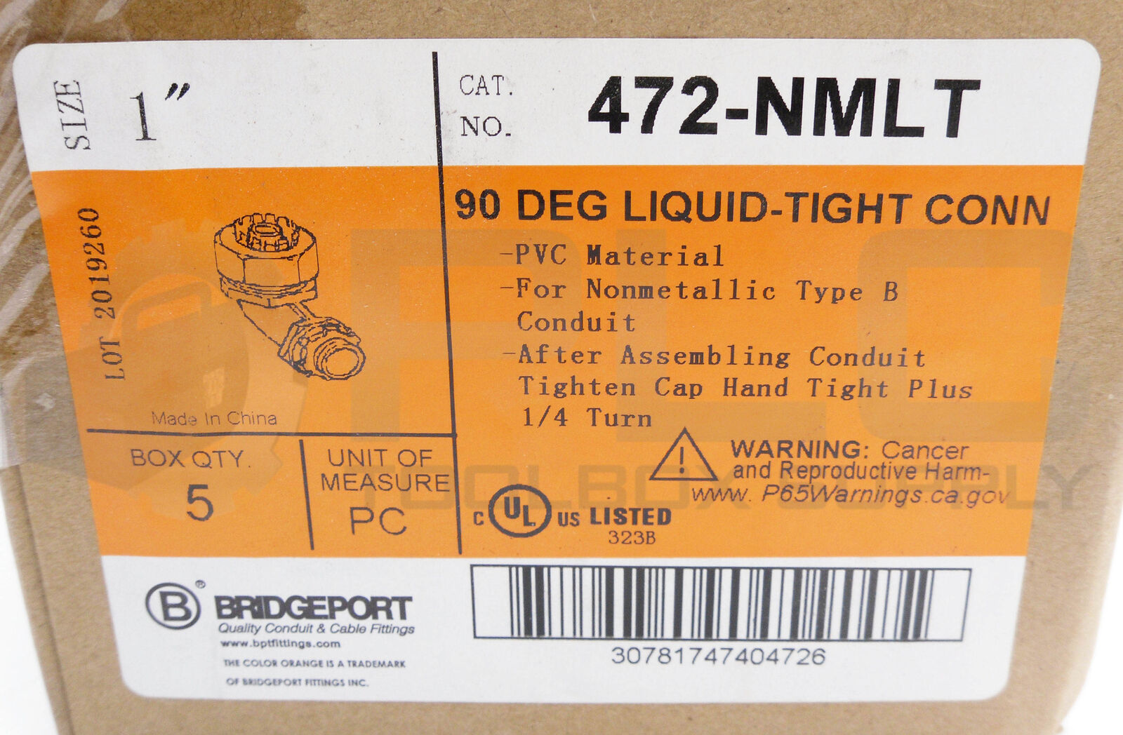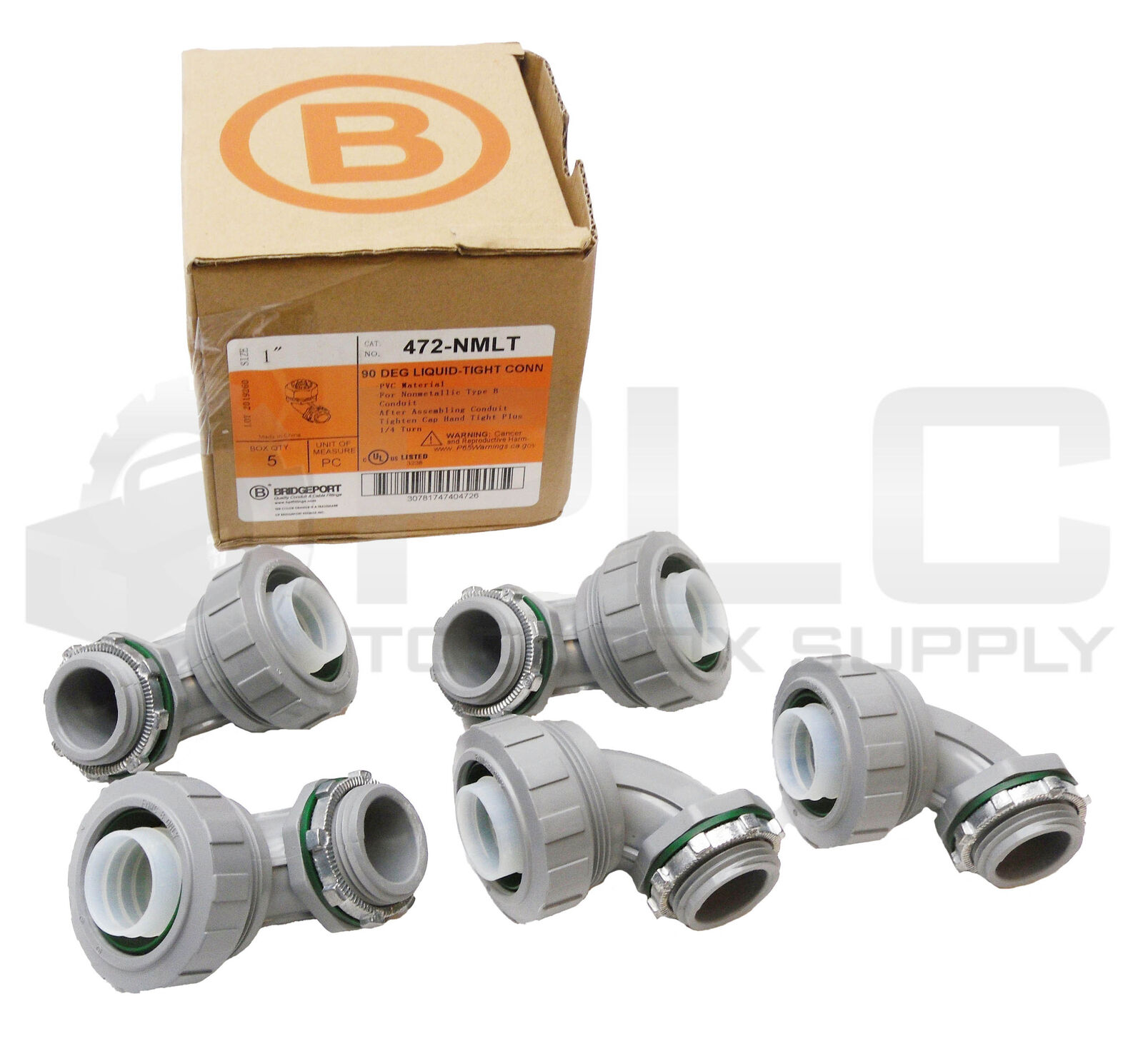 • NEW BOX OF 5 BRIDGEPORT 472-NMLT 90DEG LIQUID- TIGHT CONNECTORS 1"