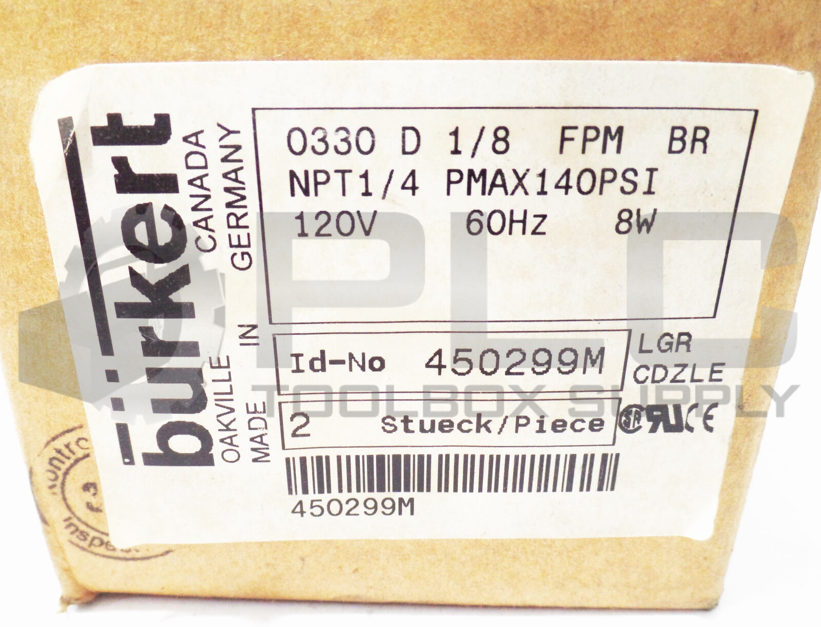 NEW BURKERT 450299 SOLENOID VALVE NPT 1/4 PMAX 140 PSI