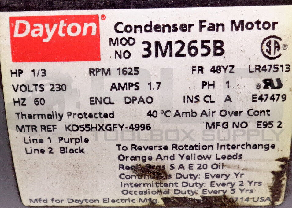 NEW DAYTON 3M265B CONDENSER FAN MOTOR HP1/3 RPM1625 230V 1.7A PH1 60HZ