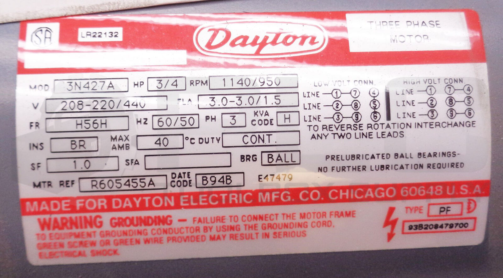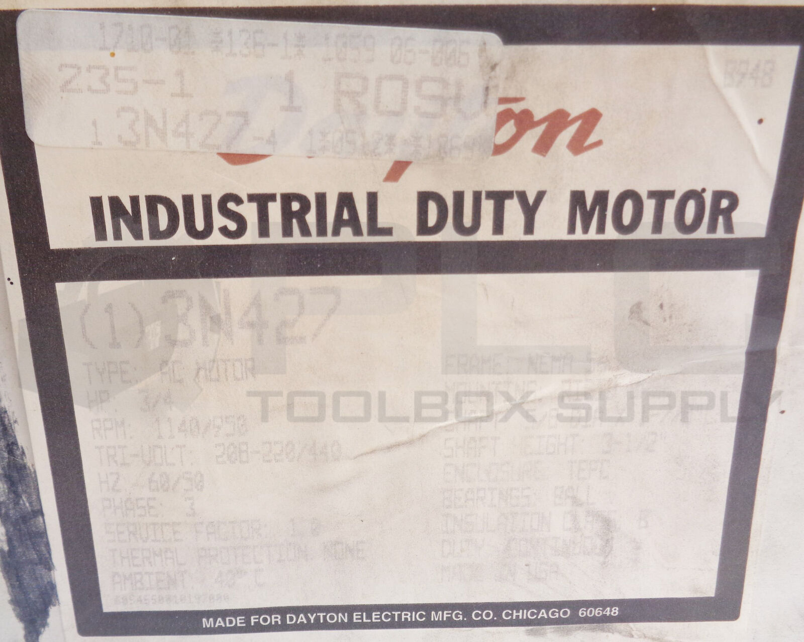 • NEW DAYTON 3N427 AC MOTOR 3/4HP 1140/950RPM 3PHASE 60/50HZ FR:H56H