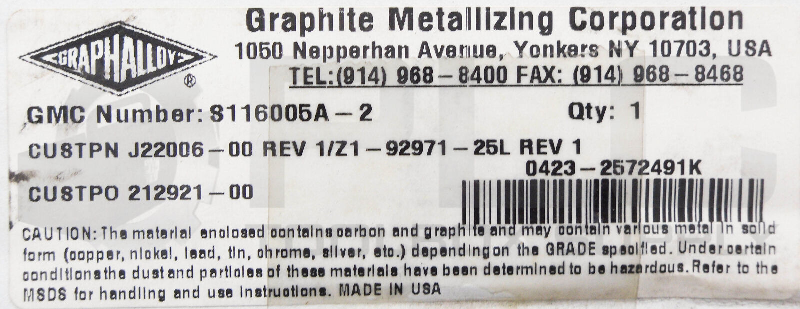 NEW GRAPHITE METALIZING CORP 8116005A-2 GRAPHITE THROTTLE SPLIT BUSHING
