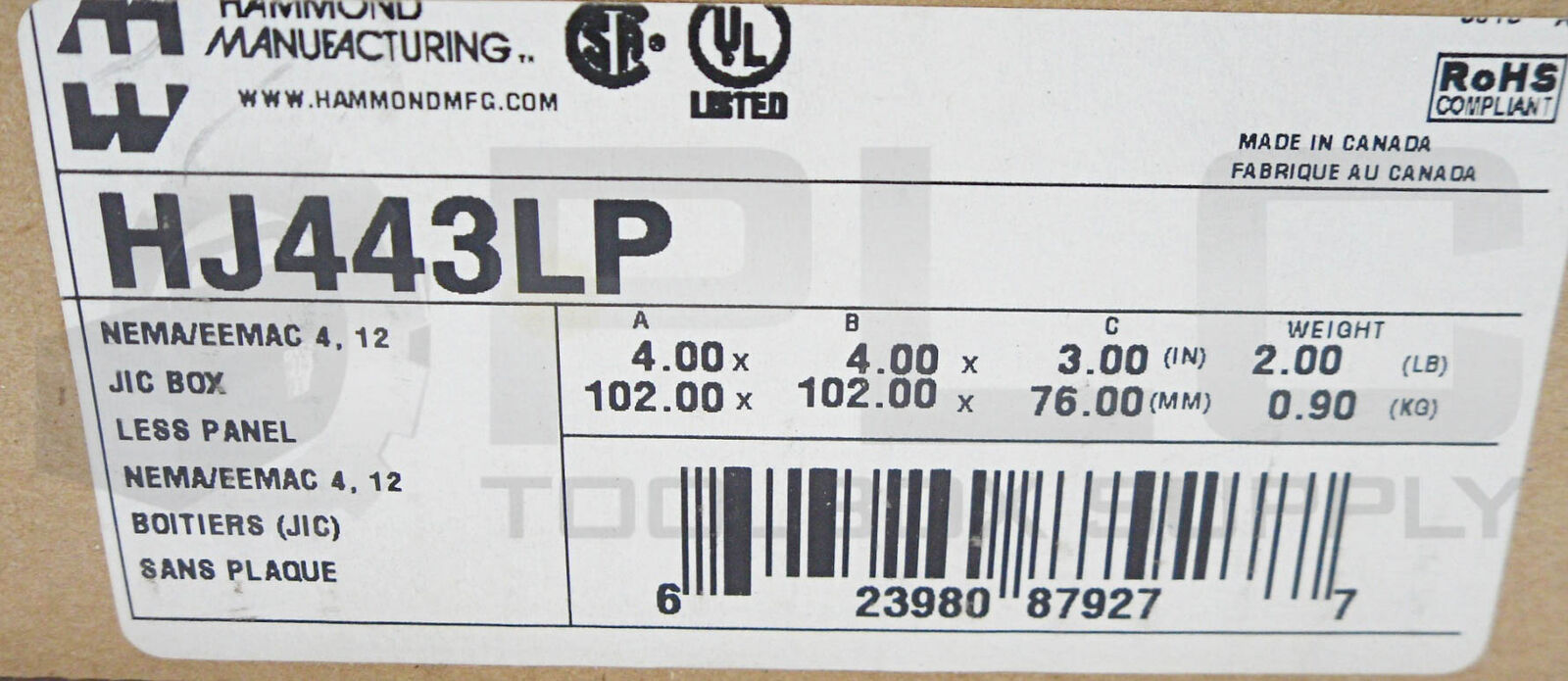 NEW HAMMOND HJ443LP NEMA/EEMAC 4, 12 JIC BOX, 4 x 4 x 3in