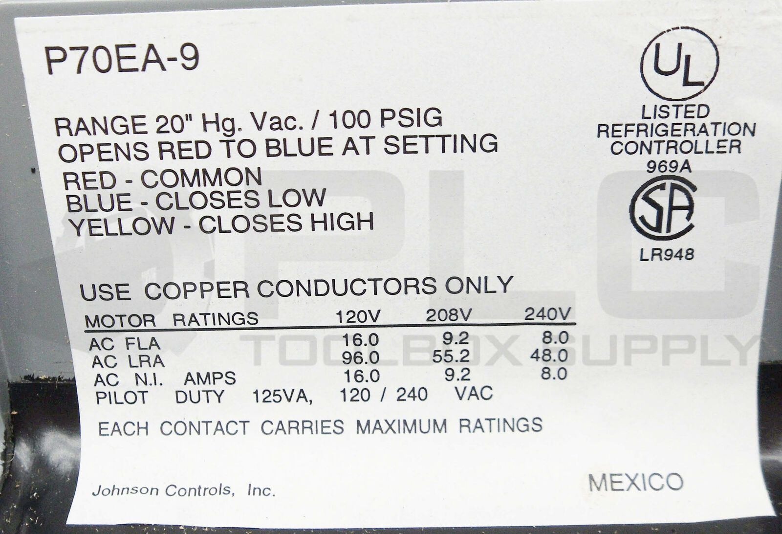 NEW JOHNSON CONTROLS PENN P70EA-9 PRESSURE CONTROL -20 TO 100 LBS PRES.
