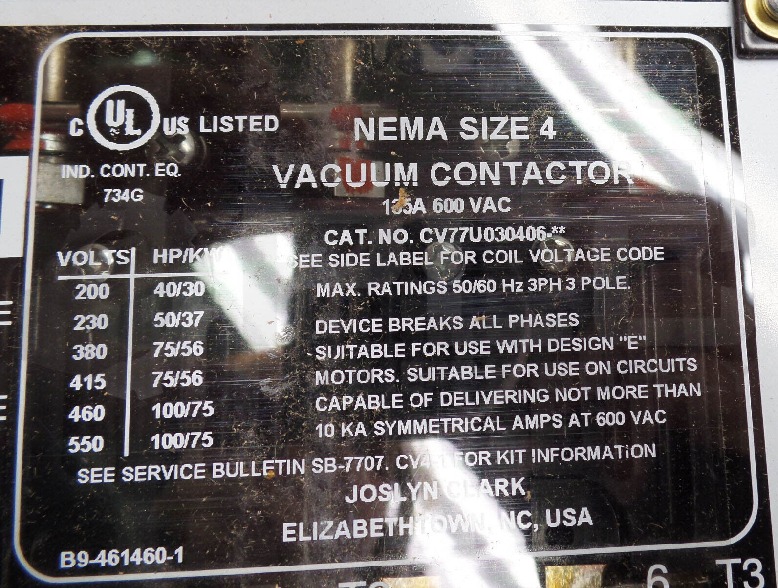 • NEW JOSLYN CLARK CV77U030406-** COMPACT VACUUM CONTACTOR W/ B77-460916A-1 COIL