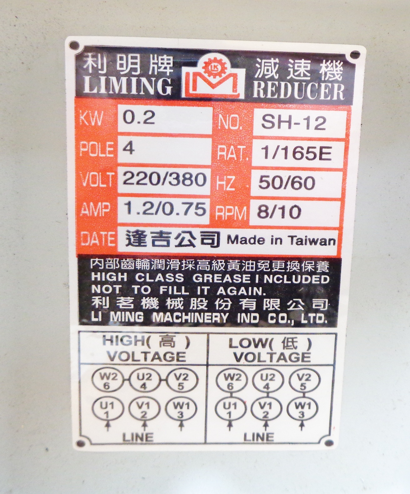 • NEW LI MING MACHINERY CO SH-12 REDUCER 4P 8/10RPM 50/60HZ 220/380V 1.2/0.75