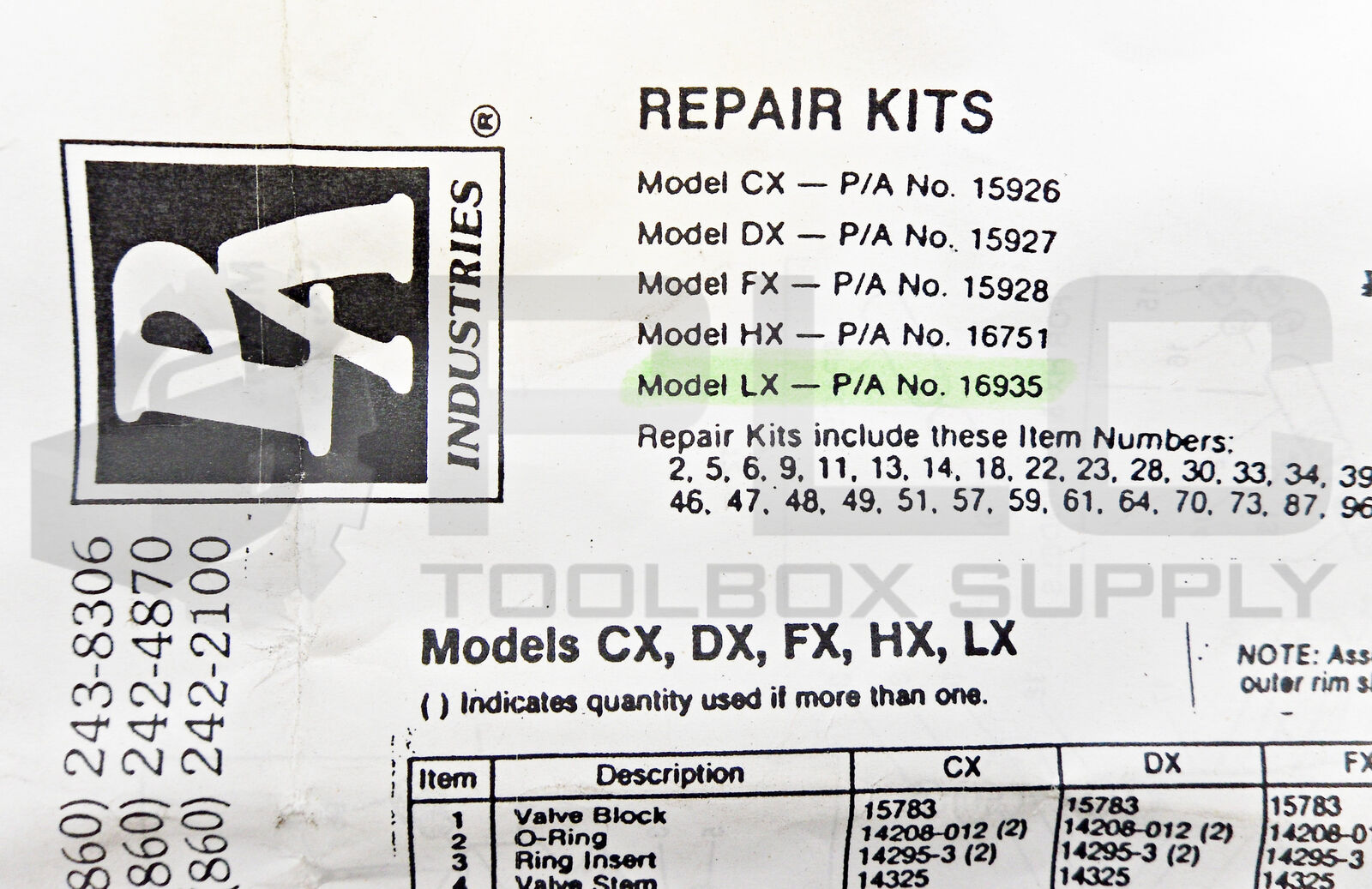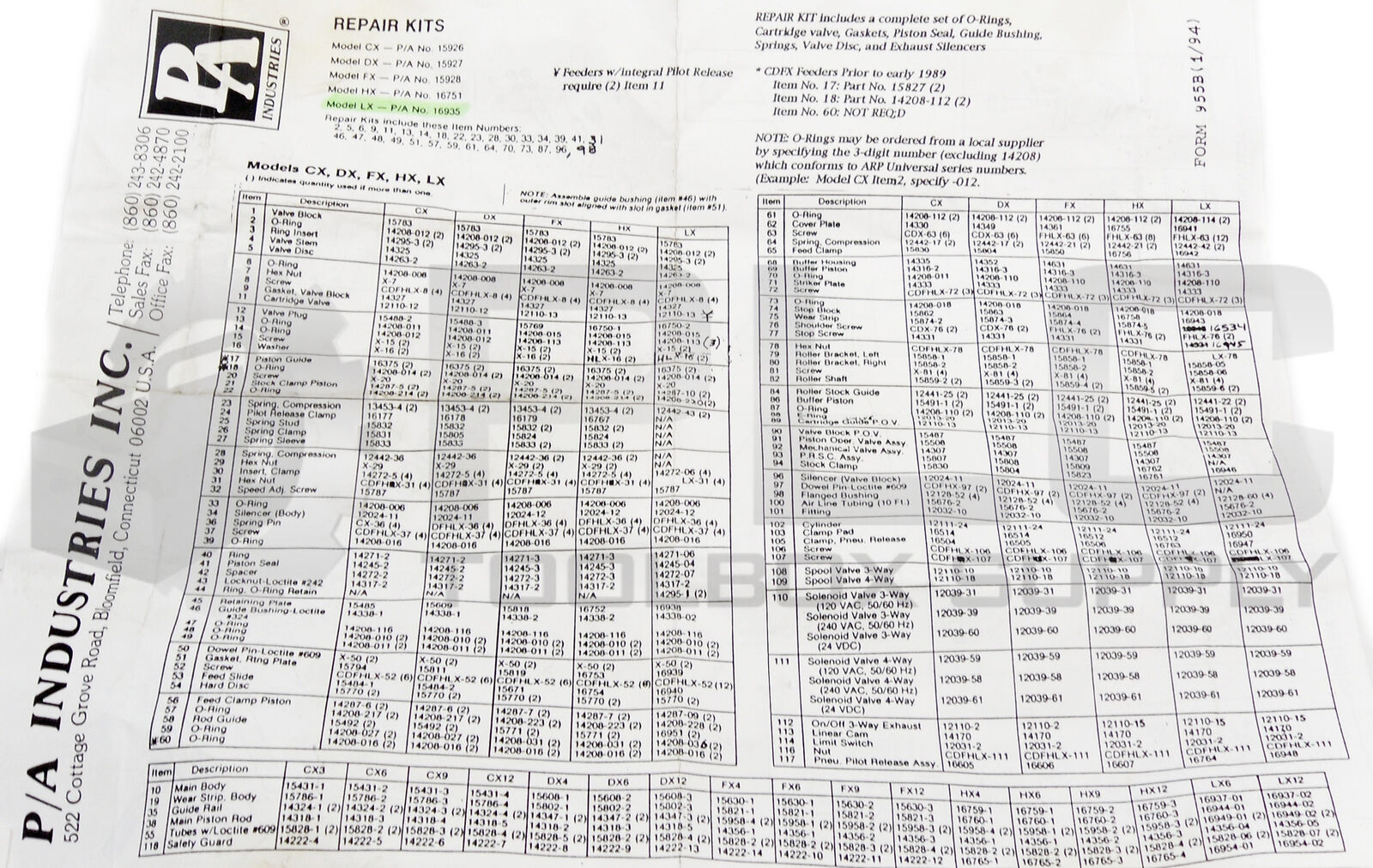 NEW PA INDUSTRIES INC. 16935 MODEL LX DIE FEEDER REPAIR KIT