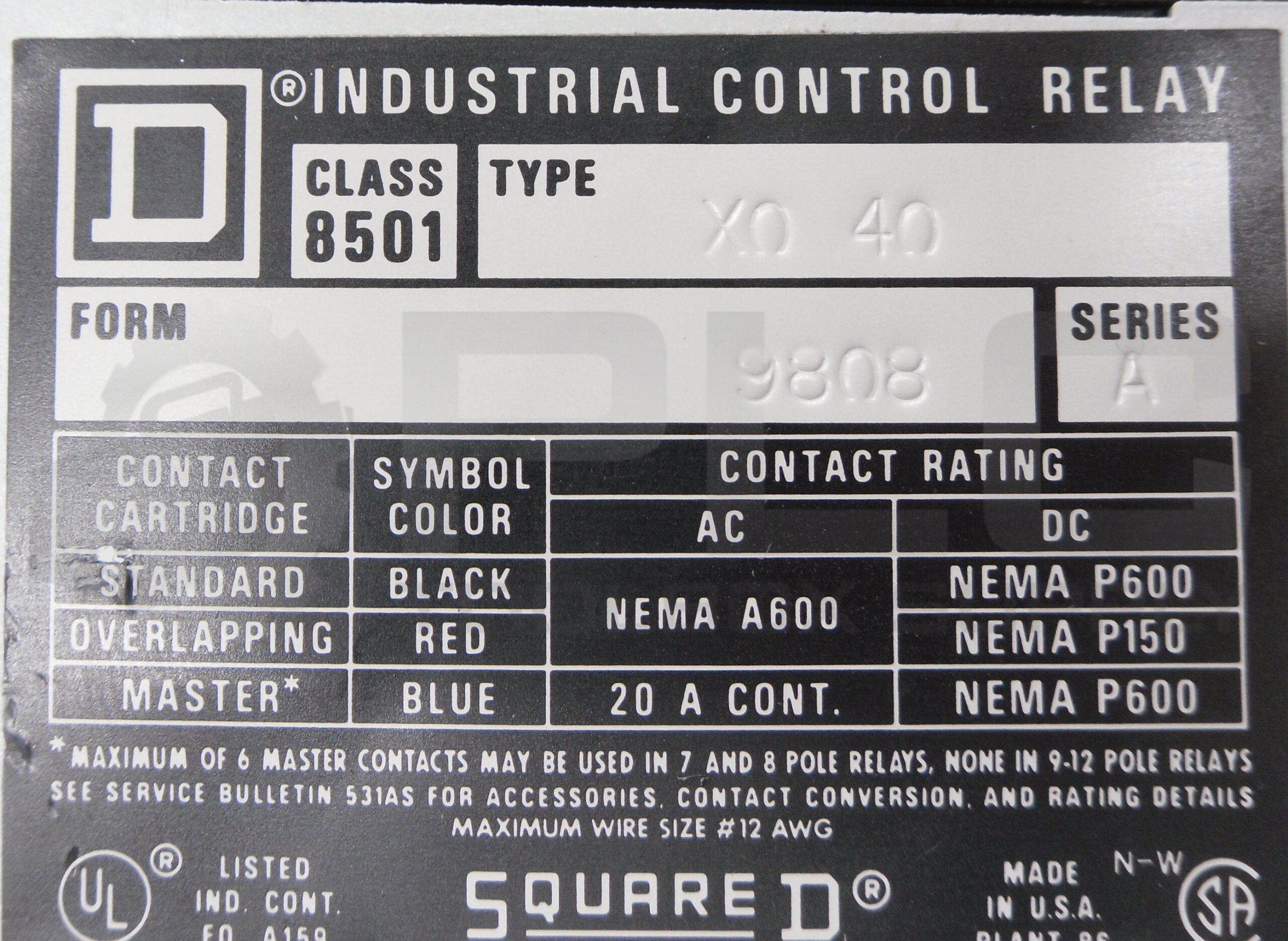 • NEW SQUARE D 8501 XO40 /A CONTROL RELAY 20A 8501 X040W/ 9998 X44 9746 COIL