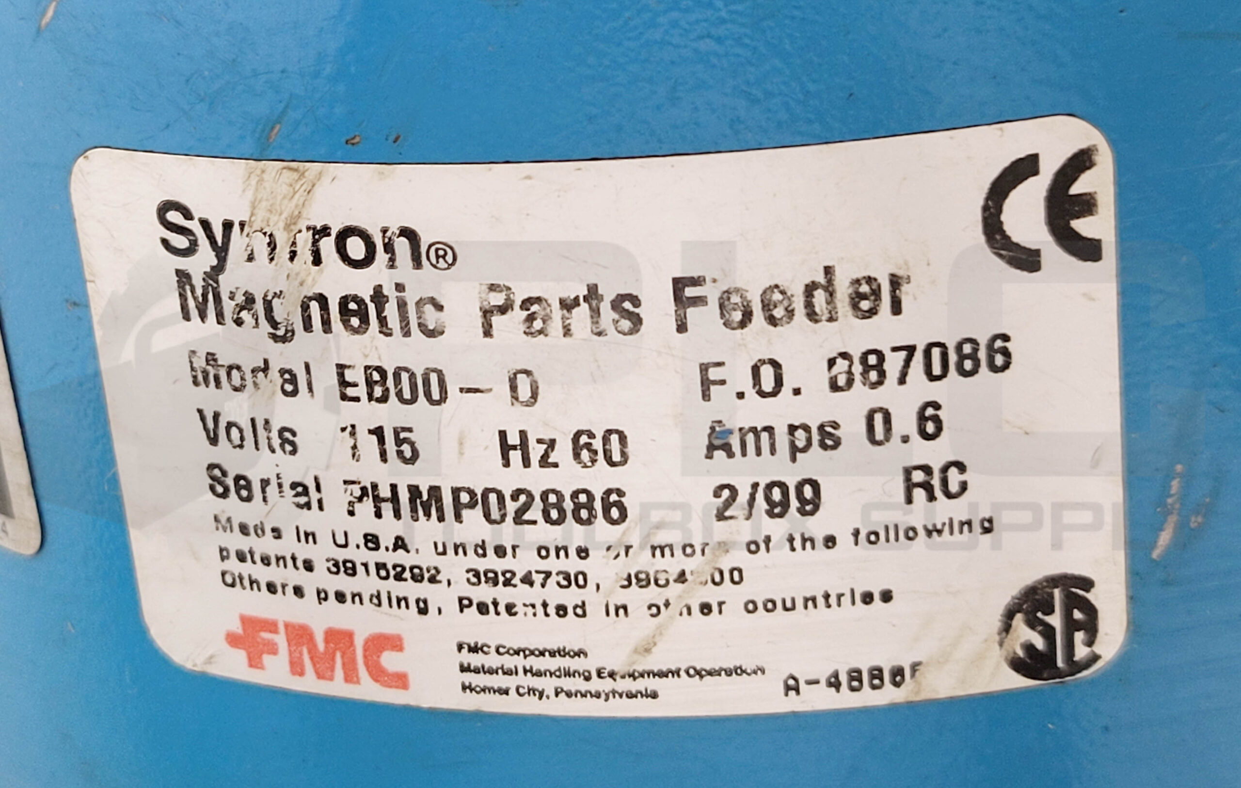 • SYNTRON EB00-D MAGNETIC PARTS FEEDER W/ B87086 BOWL W/ FMC SYNTRON POWER PULSE