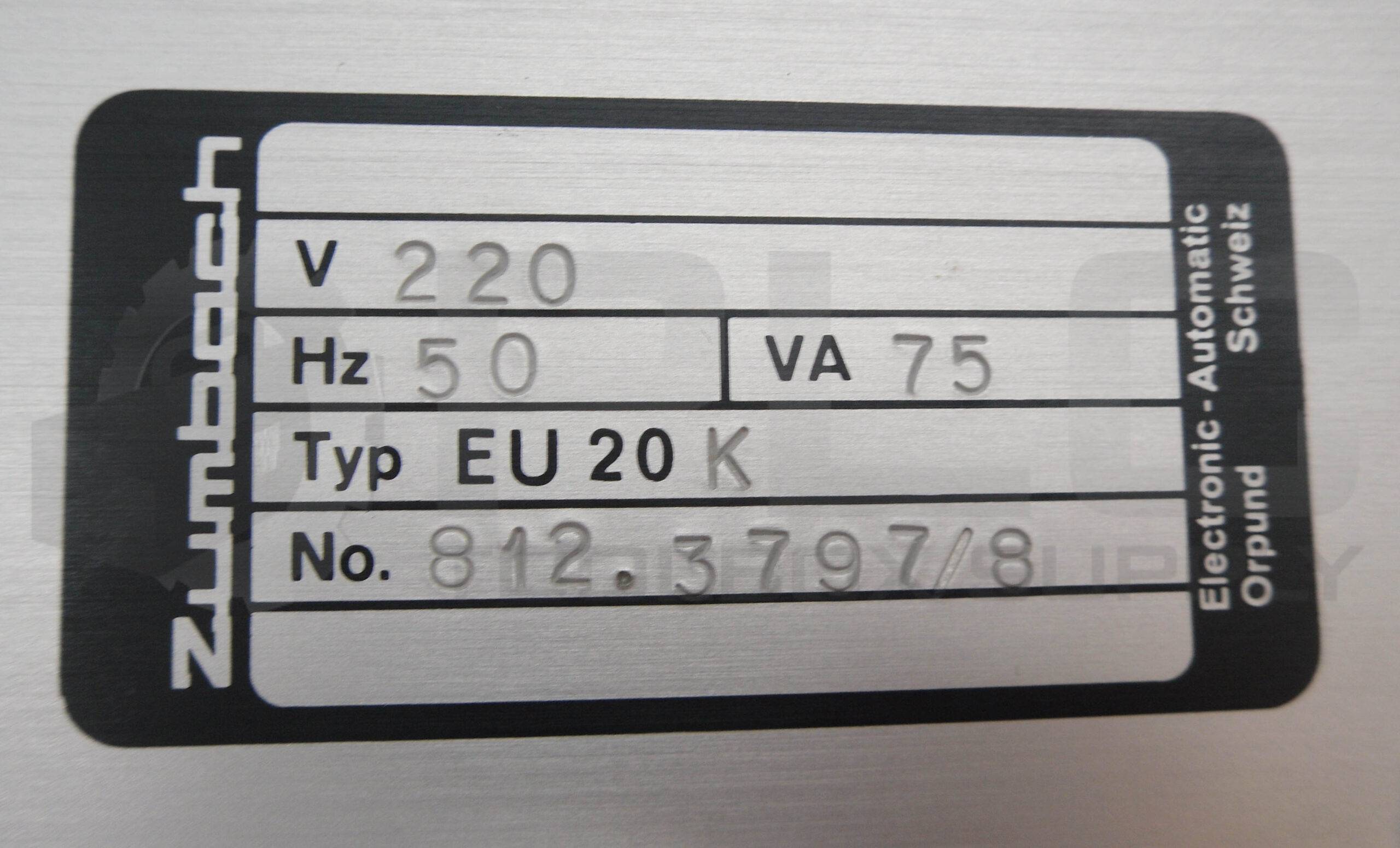 • ZUMBACH EU20 ELECTRONIC REGULATOR MODULE, 220V, 50HZ, 75VA, NO. 812.3797/8